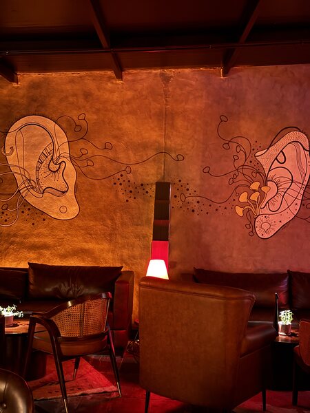 The bar hits you first. Tall, dramatic, quietly showing off. The whole place runs on a slower tempo. No one’s rushing you. No one’s hovering. The music sits in the background and lets you have a conversation. There’s this translucent wall behind the bar that looks abstract until you point your phone at it and suddenly the “error” reveals itself.